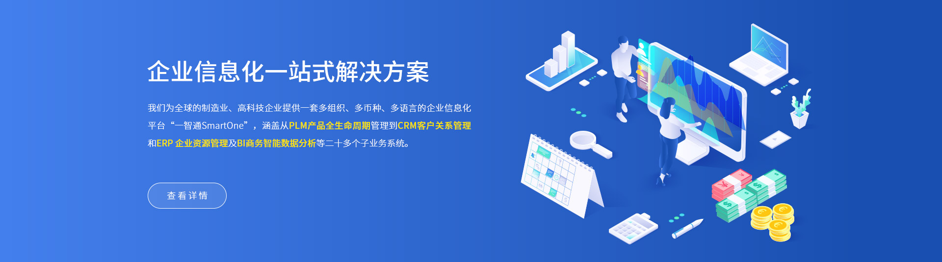 一智通(SmartOne)企業(yè)信息化一體化信息管理方案,涵蓋從 PLM 產品全生命周期管理 到CRM客戶關系管理和ERP企業(yè)資源管理及BI商務智能數據分析等二十多個子業(yè)務系統(tǒng)。