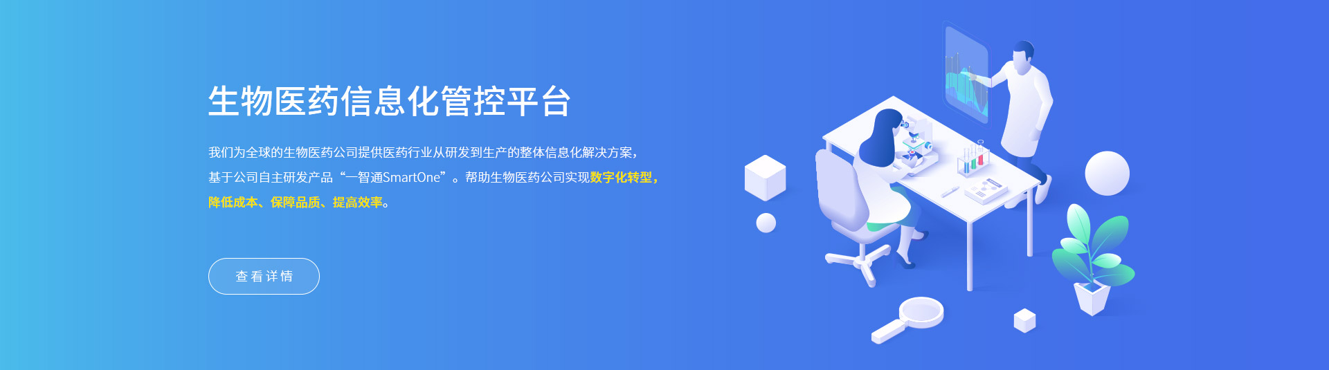 我們?yōu)槿虻纳镝t(yī)藥公司提供醫(yī)藥行業(yè)從研發(fā)到生產的整體信息化解決方案,基于公司自主研發(fā)產品“一智通SmartOne”。幫助生物醫(yī)藥公司實現數字化轉型,降低成本、保障品質、提高效率。